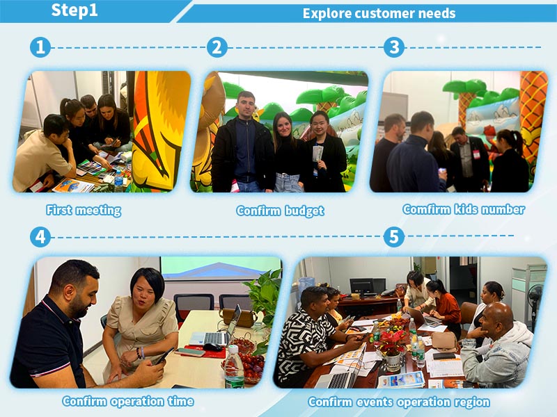 Our designer team and sales team have an meeting for adventure trampoline park with our client on the exhibition on 19th, March, 2025 . Discuss with our client to know customer specific requirements for inflatable amusement park. We need to know the budget, the kids number, operation time, and the events location.