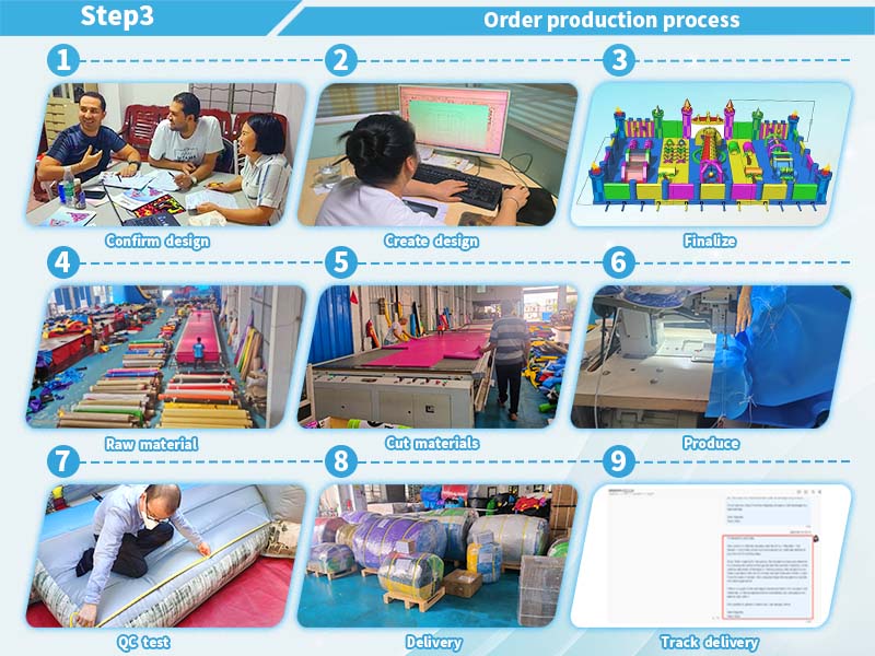 Once client confirmed the CAD design, we will start cut the material according the specification. Then our production engineer will produce the inflatable park by the sewing machine. QC team will tests to check the quality to check qualtiy, structural stability, and safety compliance. Then our sales manger will send the photo for your confirmation. Once your confirmation is ok, we will parpare the goods for delievery after we received the balance. You will receive the commercial amusement equipment after one month delievery.