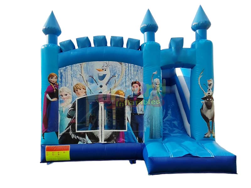 This bouncy castle with interactive games evokes a fairytale-like dream of ice and snow. Inside, a variety of animated characters come to life, each vibrant and charming. The castle's striking spires create a stunning visual experience, making children's dreams come true. A stylish, vibrant blue inflatable slide on the right side adds even more fun and adventure to the children's play experience, creating a captivating play space.