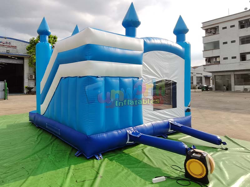 This wholesale bouncy castle features exquisite design details. Made of vibrant blue and white PVC, it's both stable and flexible, ensuring children's safety. Two blue air inlets on the base ensure efficient inflation while enhancing structural stability. Furthermore, mesh windows ensure excellent air circulation, while the spires enhance its fairytale aesthetic, ensuring children are both safe and comfortable throughout this immersive play experience.