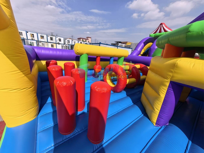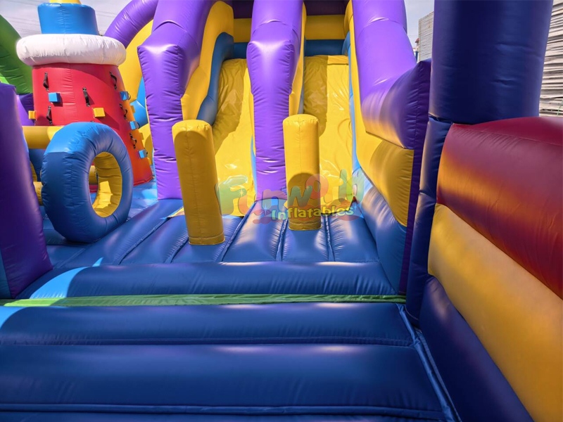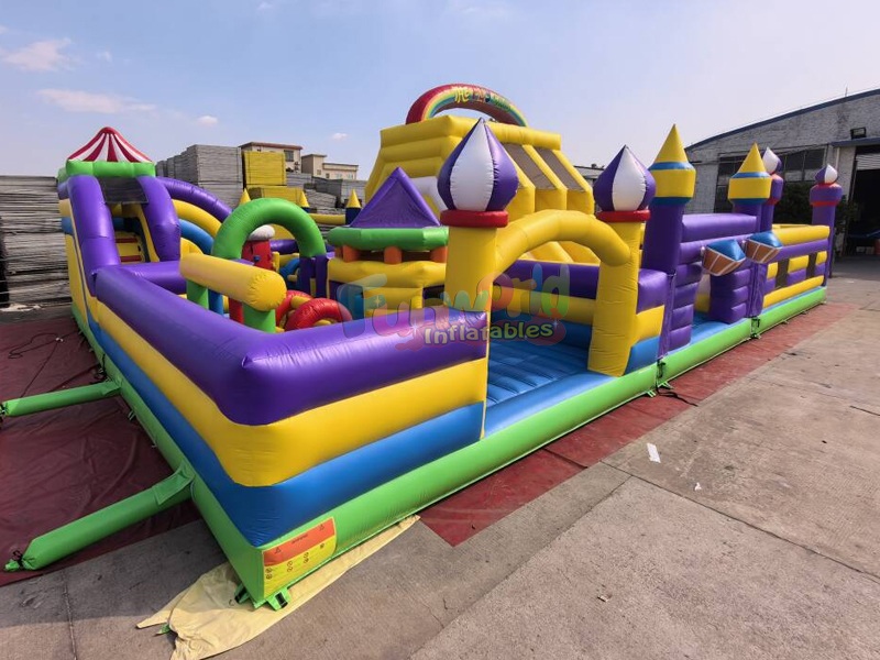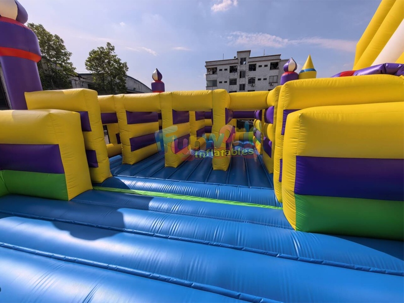 This expansive inflatable theme park is a vibrant spectacle of color and fun, designed to provide a comprehensive amusement experience for children and adults alike. Dominated by bright shades of purple, yellow, and green, the structure features a complex layout that combines multiple activities into one cohesive unit.