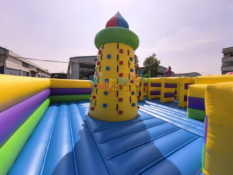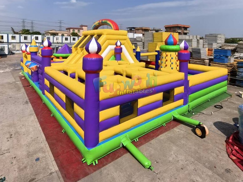 Large inflatable amusement park features a captivating castle theme with prominent purple and yellow sections, accented with green and red. Participants begin by navigating through tunnels and around vertical pop-up obstacles. The course includes a spacious bouncing area, a challenging climb to the top of a large central slide, and a thrilling ride back down. There are multiple entry and exit points, including arched doorways, and tall turrets with colorful spires enhance the castle aesthetic.