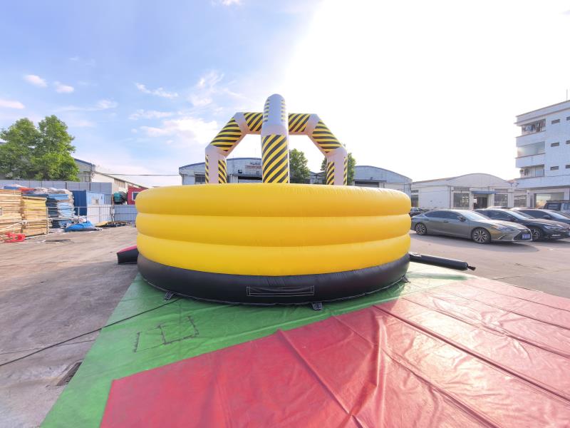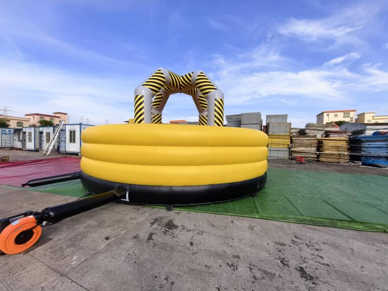 Bounce house wrecking ball features a multi-layered, inflatable, circular border, primarily in a bright, vibrant yellow color, creating a visually striking and lively appearance. The bottom of the border is reinforced with a thicker black inflatable edge, which enhances the color contrast and adds stability to the base.