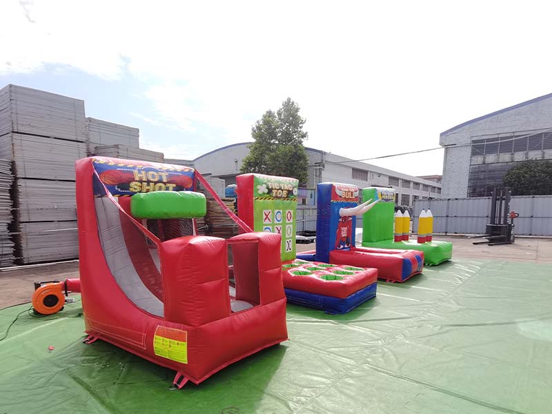 4 in 1 inflatable games is constructed from inflatable panels with red and white vertical stripes, resulting in a smooth and full surface. Transparent mesh netting is installed on the inside of the frame, providing both unobstructed visibility and protection.