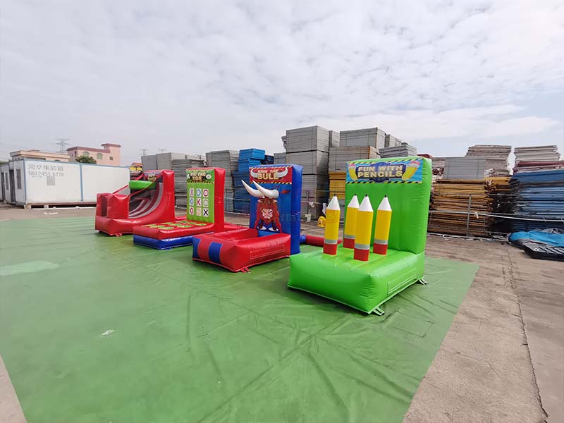 Carnival inflatable games featuring a predominantly red color scheme with colorful striped decorations and a curved passage design, creating a dynamic and lively appearance.Another inflatable game features a red and blue color scheme with colorful game panels adorned with patterns and symbols, offering rich visual elements.A blue and red contrasting structure is paired with a red cartoon bull image and giant white horns, resulting in a striking and adorable design;The top is printed with the words "FUN WITH PENCILS" in yellow, and the structure is embedded with four giant pencil-shaped decorations in yellow, white, and red, creating a strong color contrast and a playful, childlike feel.