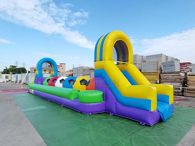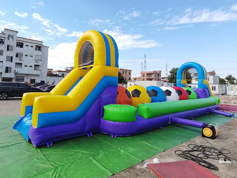 Football inflatable sport games. The exterior design is precisely tailored to attract attention for outdoor activities. The color scheme uses high-saturation contrasting colors, with clear and vibrant color block divisions that easily catch the eye from a distance in outdoor settings.The slide on the left is paired with a matching arched inflatable doorway, featuring a rounded and sturdy silhouette; the passage section incorporates multiple inflatable decorations resembling soccer balls in red, yellow, blue, and white, reinforcing the sporty and fun visual theme and making the flat passage appear three-dimensional and lively.The small arched structure at the end of the passage creates a symmetrical design with the starting doorway, resulting in a coherent and complete overall form. The full, inflated texture also conveys durability.