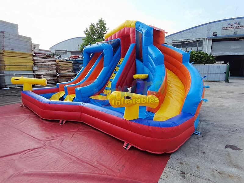 Backyard inflatable slide. Featuring a multi-lane, three-dimensional layout, it includes multiple racing slides and a spiral slide. Slides with varying slopes and directions are arranged in a staggered pattern, creating a rich and layered design. Blue inflatable safety barriers extend along both sides of the slides, ensuring safety while enhancing the fluidity of the lines.A yellow inflatable water spray device in the shape of a water gun is positioned at the front of the slide, complementing the colors of the slides and adding visual interest. The thick, rounded edges of the red inflatable pool at the bottom provide a stable and full shape when inflated, with smooth and elastic lines.