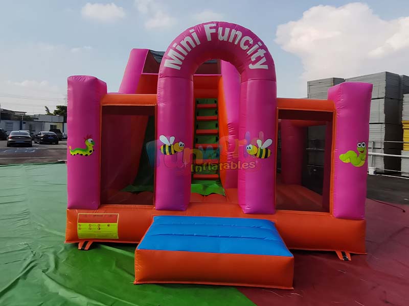 Bouncy castle inflatable slide, paired with blue inflatable steps and topped with a curved arch, is instantly recognizable and full of childlike playfulness. The pink inflatable columns are plump and crisp, and the sides are adorned with cute cartoon designs of bees and green insects, imbuing the slide with a lively, fairytale feel. A transparent mesh protective structure ensures safety while adding a sense of transparency. The blue inflatable steps at the entrance blend seamlessly with the main color scheme, creating a vibrant miniature fairytale castle that easily captures children's attention and creates a joyful atmosphere.