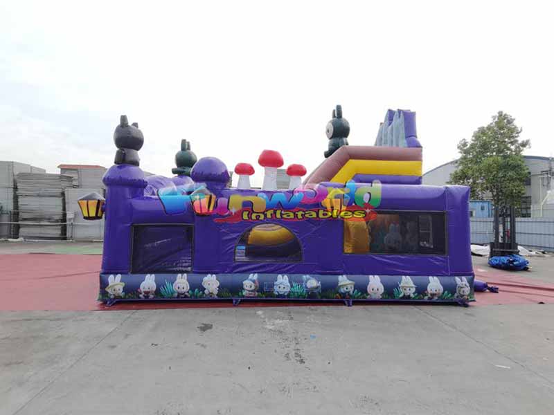 Labubu inflatable outdoor bounce house. Featuring a mysterious dark purple base, combined with lightning patterns and vintage yellow and black lanterns, the overall atmosphere perfectly matches LABUBU's whimsical and fantastical setting. The exterior is covered with cartoon images of the LABUBU family, and three-dimensional inflatable figures are placed on the top and pillars, resulting in a high density and accurate representation of the IP elements.