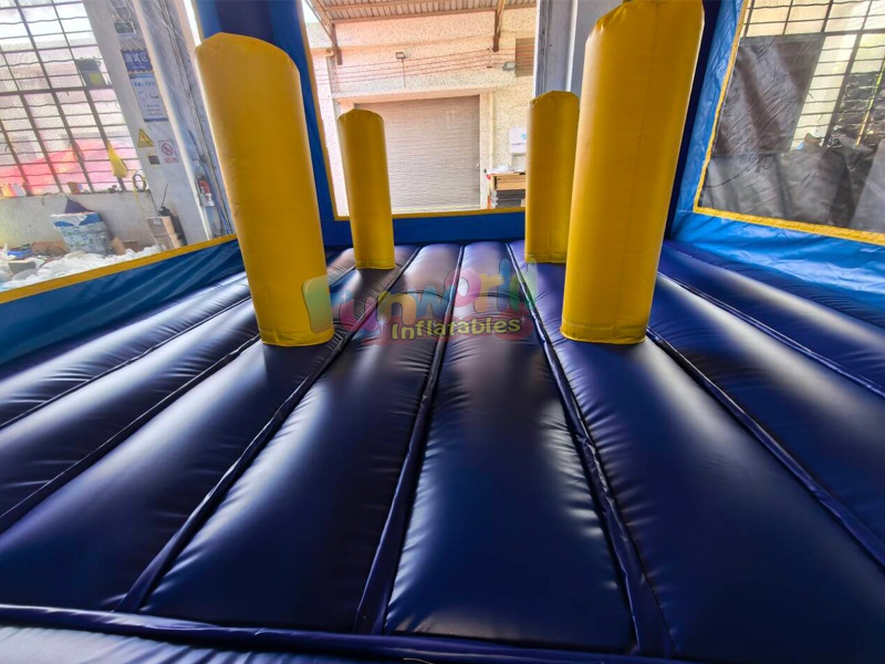 The structure features four prominent turrets topped with yellow pointed peaks, giving it a classic fortress aesthetic. This bouncer is more than just a jumping area. Typically measuring approximately 13'L x 13'W, it offers an expansive interior for kids to jump, play, and burn off energy. Many versions of this unit include an integrated obstacle pillars inside, adding another layer of fun to the bouncing experience.