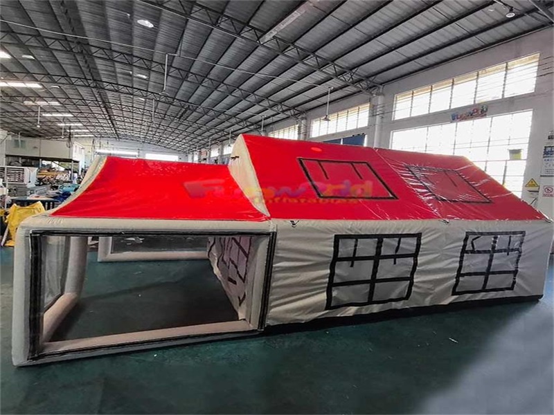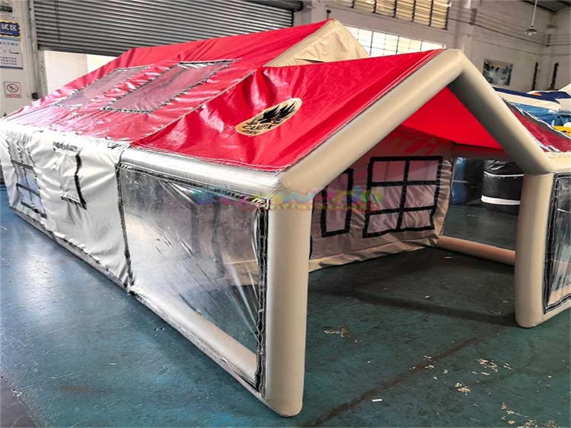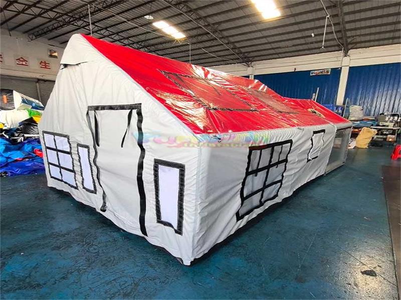 House inflatable tent exterior resembles a house. Its light beige inflatable frame creates a simple, streamlined structure, while the vibrant red canopy creates a striking contrast and creates a powerful visual impact. Large transparent windows on the sides, some with black checkered embellishments, enhance the sense of airiness and imbue the exterior with the details and texture of a real house. The overall design is striking and approachable, making it a visual focal point in any setting.