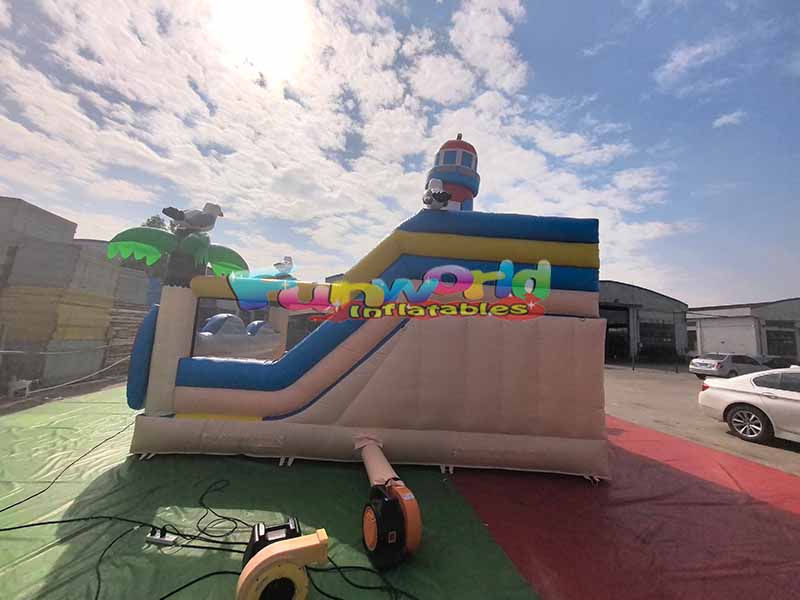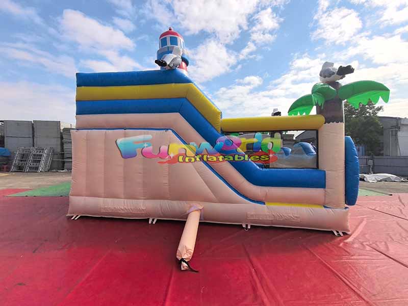 Commercial inflatable bounce house has a seaside resort atmosphere, with a tall lighthouse-shaped main tower surrounded by adorable seagulls and lush green palm trees.
