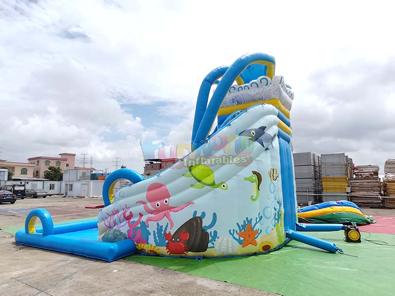 Octopus inflatable water slide features a thick, elastic, and wear-resistant material, providing a safe and comfortable experience.A central climbing area with green steps allows for easy access to the top. The smooth surface on both sides, created by the inflatable structure, allows for a smooth, engaging slide. The sleek design and stable structure when inflated make it suitable for a variety of outdoor leisure activities, bringing joy to people of all ages.