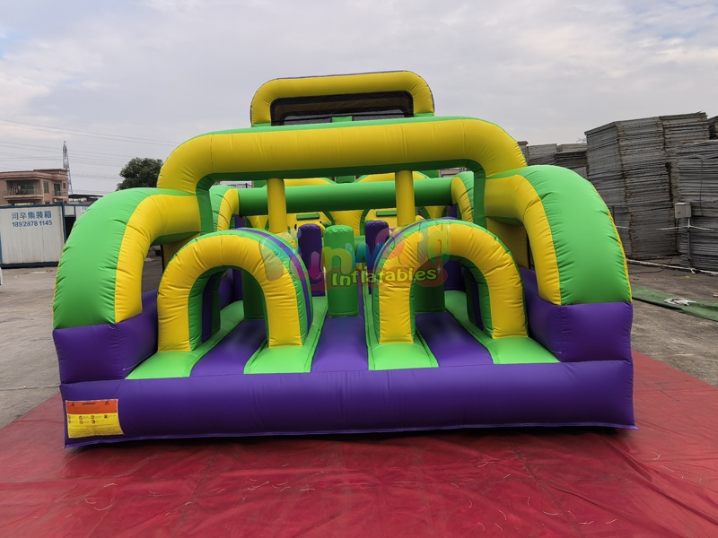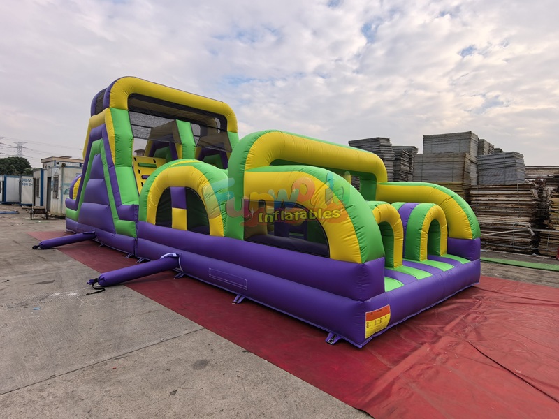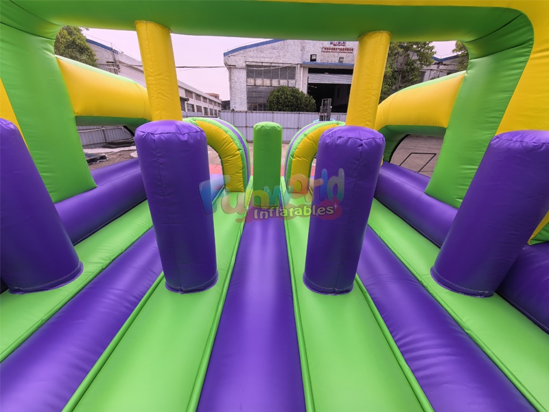 Outdoor backyard adult inflatable obstacle course bounce house,it's a dynamic and engaging attraction designed for events, parties, and team-building activities. Dominated by a striking color palette of deep purple, lime green, and bright yellow, the unit promises a visually exciting challenge for participants of various ages.