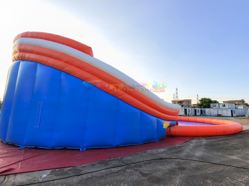 Giant inflatable water slide. The end of the slide is equipped with thick red cushioning pads. The pads have a wear-resistant texture on the surface and are made of a material that is both elastic and tear-resistant, effectively cushioning the impact of sliding. The connection between the cushioning pads and the slide is tight and seamless, without gaps or raised edges, eliminating the risk of scratches or injuries.
