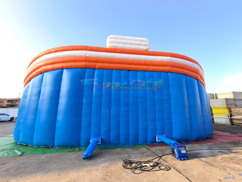 This is a crazy inflatable water slide. All seams of the inflatable structure are neatly heat-sealed, with clear edge lines, enhancing the structural integrity. The different colored PVC materials are seamlessly joined with natural transitions and no noticeable color differences, resulting in a more refined appearance.