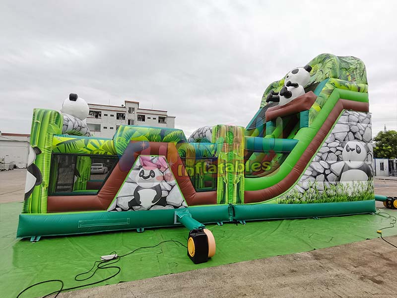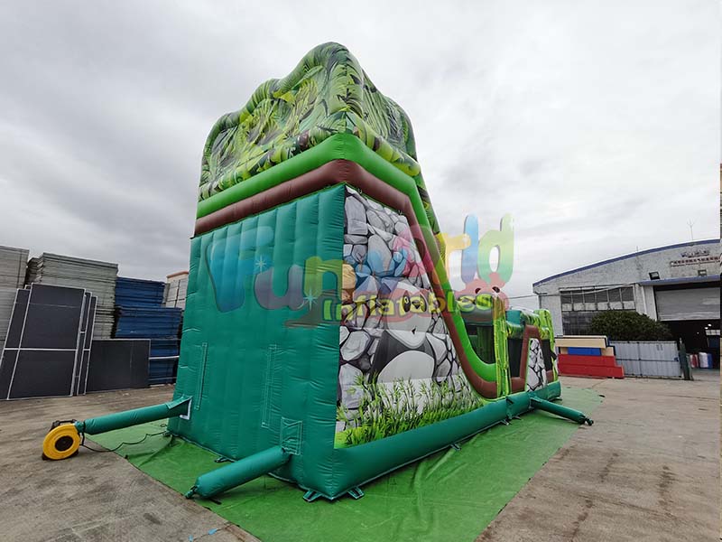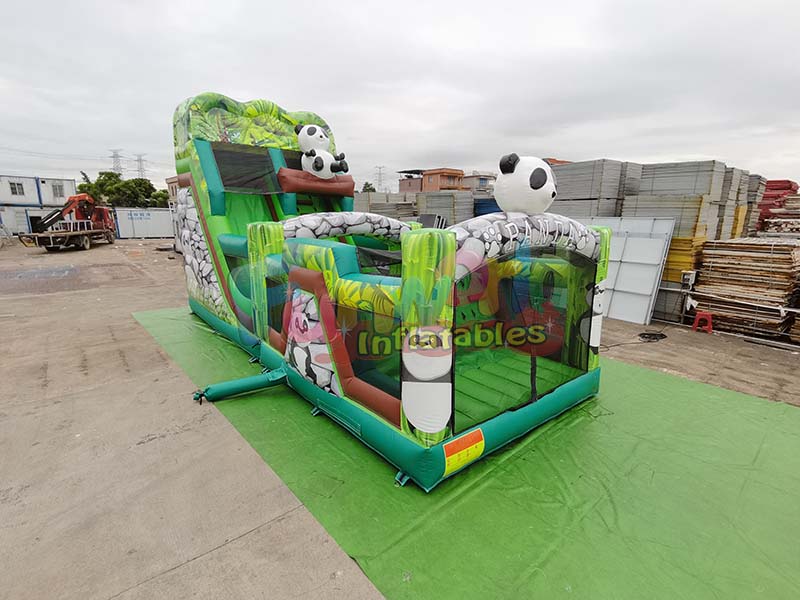 Panda animal inflatable slide creates a rich jungle atmosphere. The equipment is adorned with several adorable black and white panda cartoon characters, adding to its charm. Combined with realistic jungle plant patterns and cartoonish rock textures, the slide exudes a natural and playful feel. Its strong visual appeal easily sparks children's curiosity and enjoyment.
