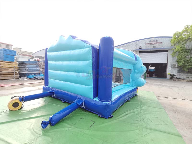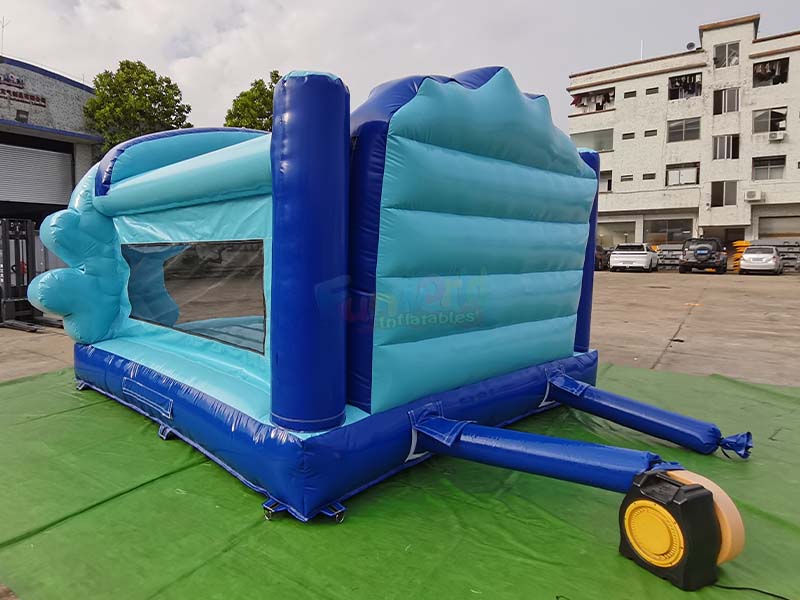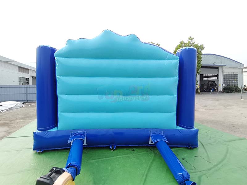 Bluey toddler bounce house. The sides feature a double-layered inflatable beam design; the upper light blue main frame and the lower dark blue load-bearing beam form a stable support structure. The surface of the dark blue inflatable beam at the bottom has heat-sealed embossing, which acts as an extra reinforcement layer to disperse ground impact and prevent wear and deformation of the bottom.