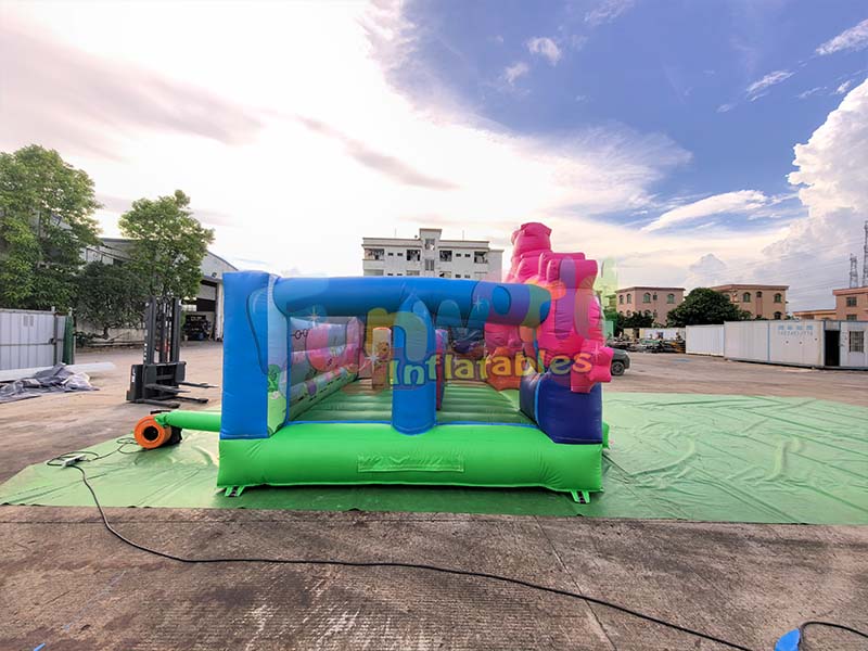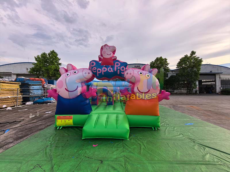 Peppa pig bounce house is made of wear-resistant and tear-resistant PVC material, featuring an inflatable castle structure and decorated with Peppa Pig characters;