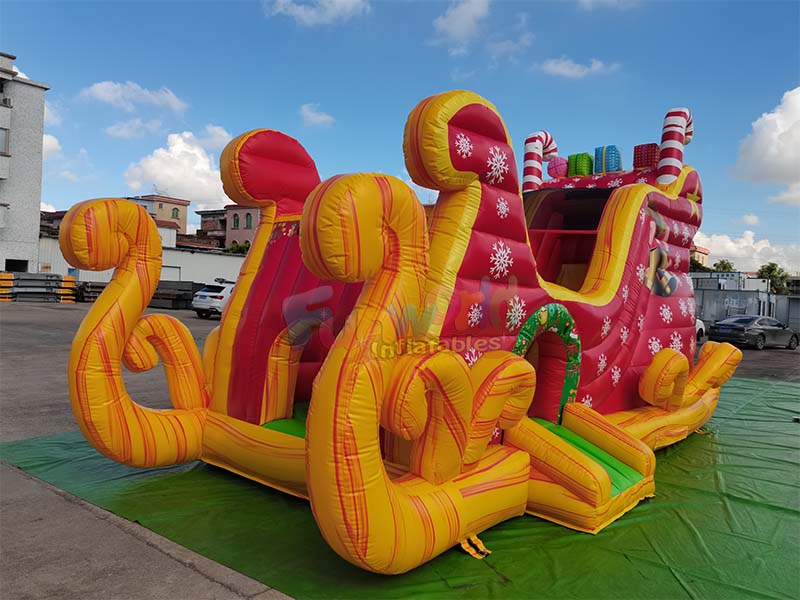 Christmas inflatable bounce house creates a striking visual impact. Its exterior is embellished with white snowflake patterns, creating a rich Christmas atmosphere. The yellow section features orange and yellow stripes resembling candy canes, and the exaggerated, curved, candy-like trims on each side create a lively and childlike design. The top is also decorated with a colorful gift box and red and white candy cane designs, adding rich details. This inflatable bouncer recreates the classic image of a Christmas sleigh, while the full, inflatable form and rich decorations create a dreamy and eye-catching visual effect.
