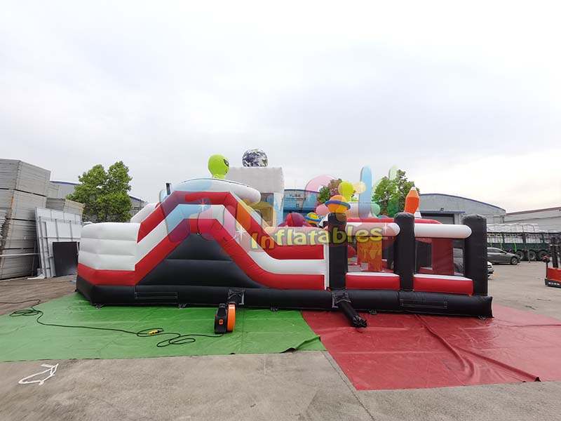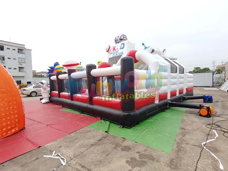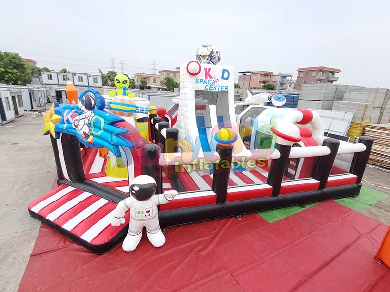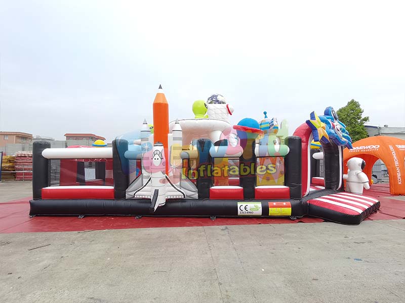 Large inflatable bounce house, themed around space exploration, features slides, a jumping area, and fun tunnels, all in vibrant colors and lifelike designs.