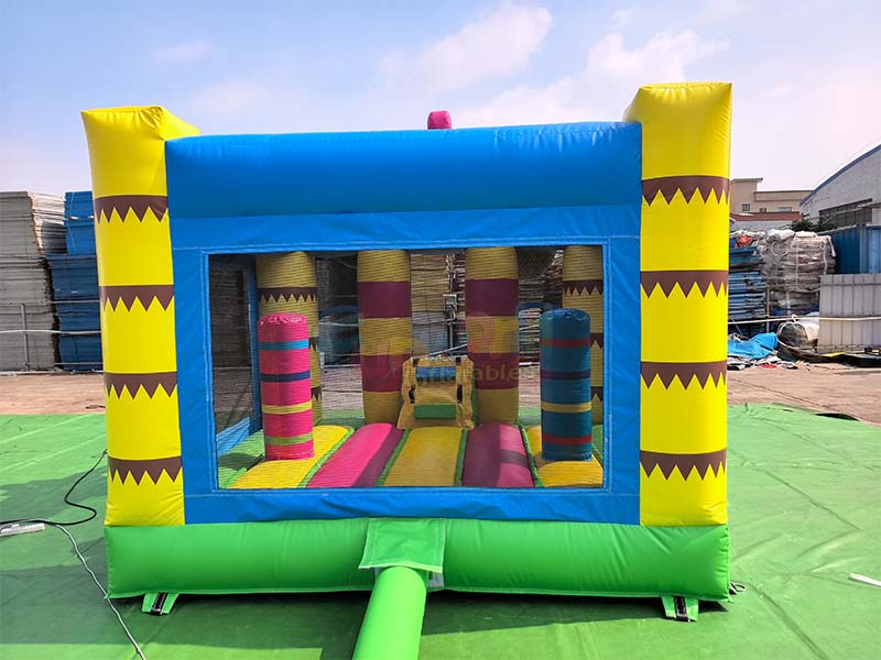 Inflatable jungle bounce house. The yellow support columns in the corners are printed with dark brown, jagged cartoon patterns, creating a lively visual style; the columns feature a thickened inflatable design, seamlessly connecting to the base, enhancing the overall structural load-bearing capacity and stably supporting multiple people playing at the same time.